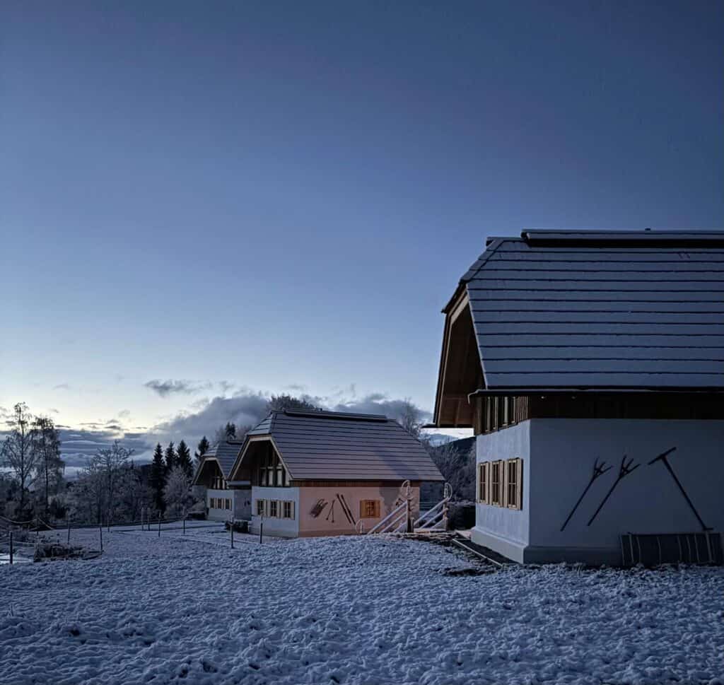 Ebner 1822 liegt hoch über dem Gurktal in Kärnten, umgeben von Wäldern, Bergen und einem stillen Naturteich. Unsere drei handgebauten Bauernhäuser aus Holz, Stroh und Lehm schaffen ein wohngesundes, warmes Raumklima – ideal nach einem Tag im Schnee. Drinnen knistert der Holzofen, draußen glitzert der Schnee.