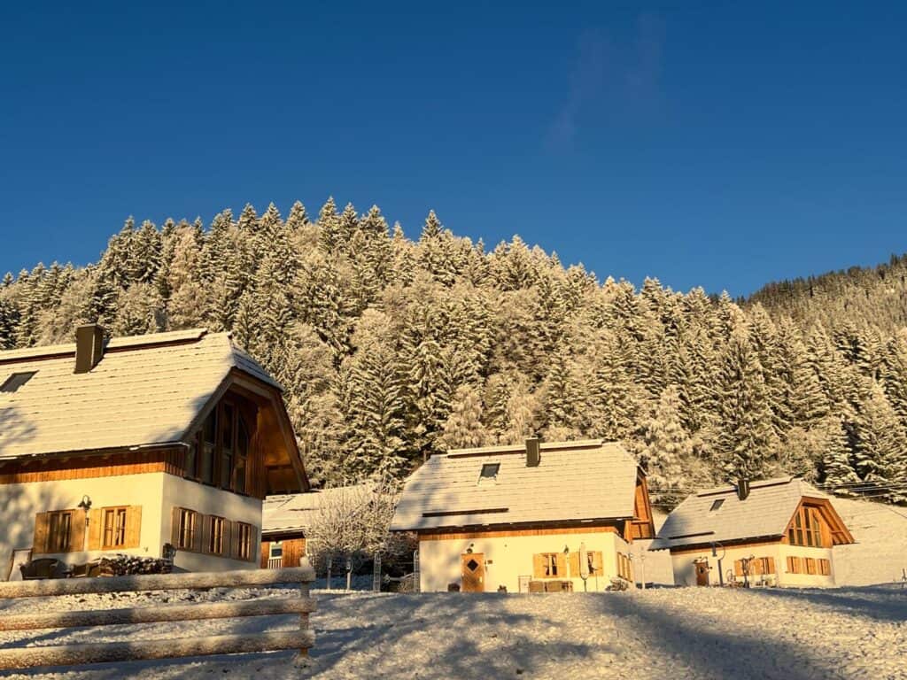 Wenn draußen leise der Schnee fällt und die Nockberge in Winterruhe liegen, werden unsere drei Natur-Ferienhäuser aus Holz, Stroh und Lehm zum Rückzugsort